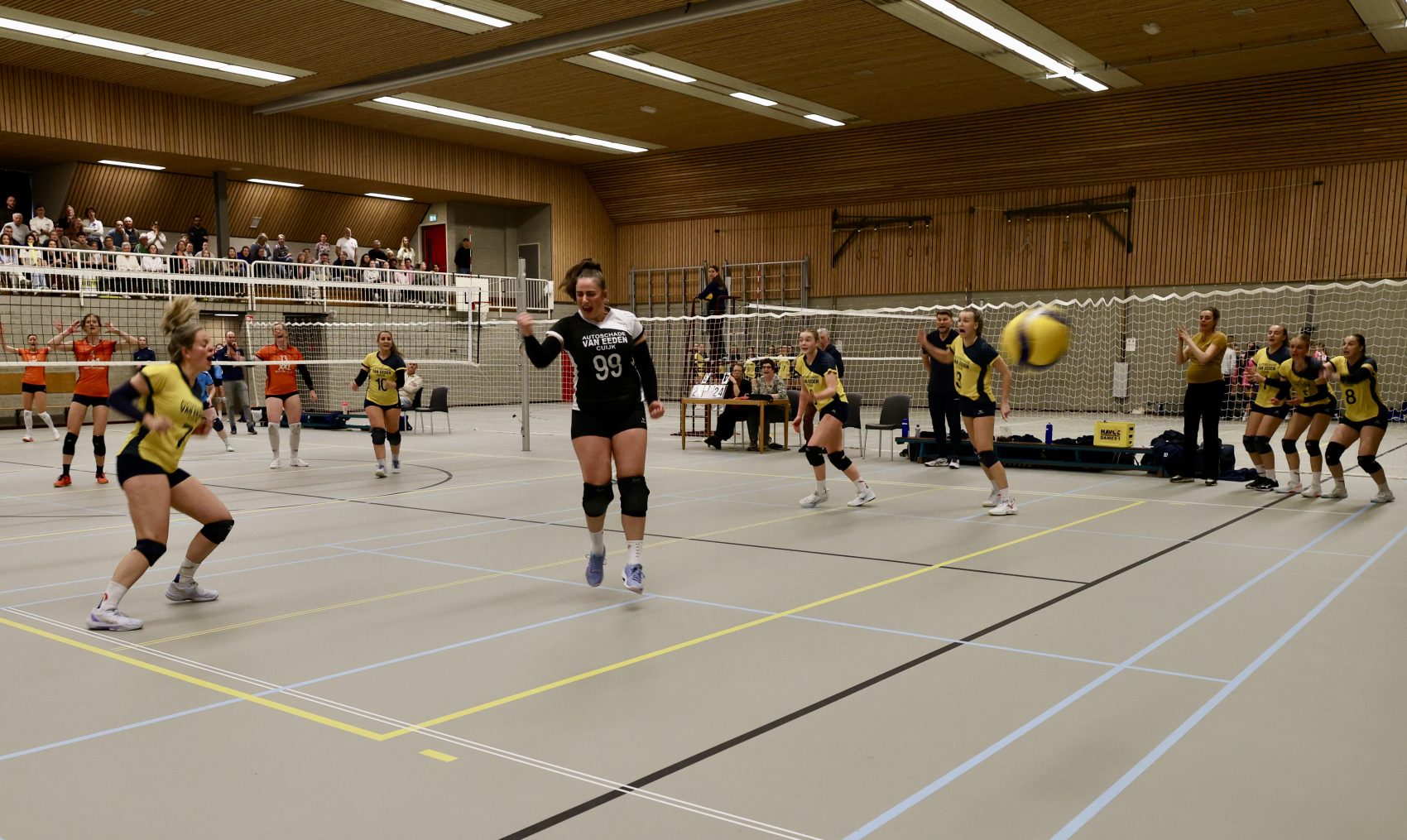Deze opdracht is echter niet zomaar te verwezenlijken aangezien de tegenstander op deze zaterdagmiddag 4 april 2026 VC Polaris Dames 1 is uit Helmond. De laatste keer dat deze teams elkaar troffen in Helmond was er een winst voor VC Polaris Dames 1 van 3-1. Echt een goed team dat de 4e plaats op de ranglijst bezet. Het team van HaVoC Dames 1 heeft daarom iedereen in het Hapse opgeroepen om het eigen team te komen aanmoedigen om ze naar de overwinning te ondersteunen. En dat heeft effect gesorteerd: de tribune was propvol bezet om de dames naar een setwinst te schreeuwen, toeteren en te trommelen.