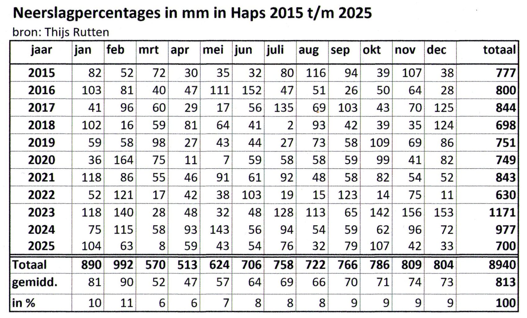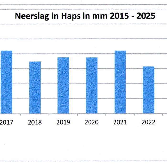 Nadere analyse neerslagcijfers van de afgelopen jaren in Haps op basis van de metingen van Thijs Rutten in het centrum van Haps over de jaren 2015 tot en met 2025.