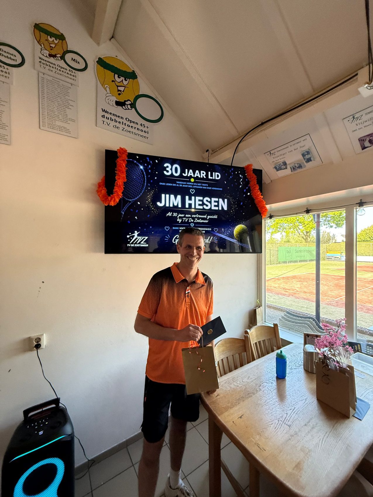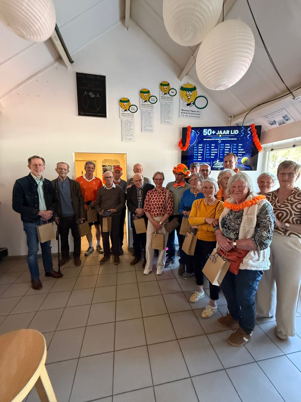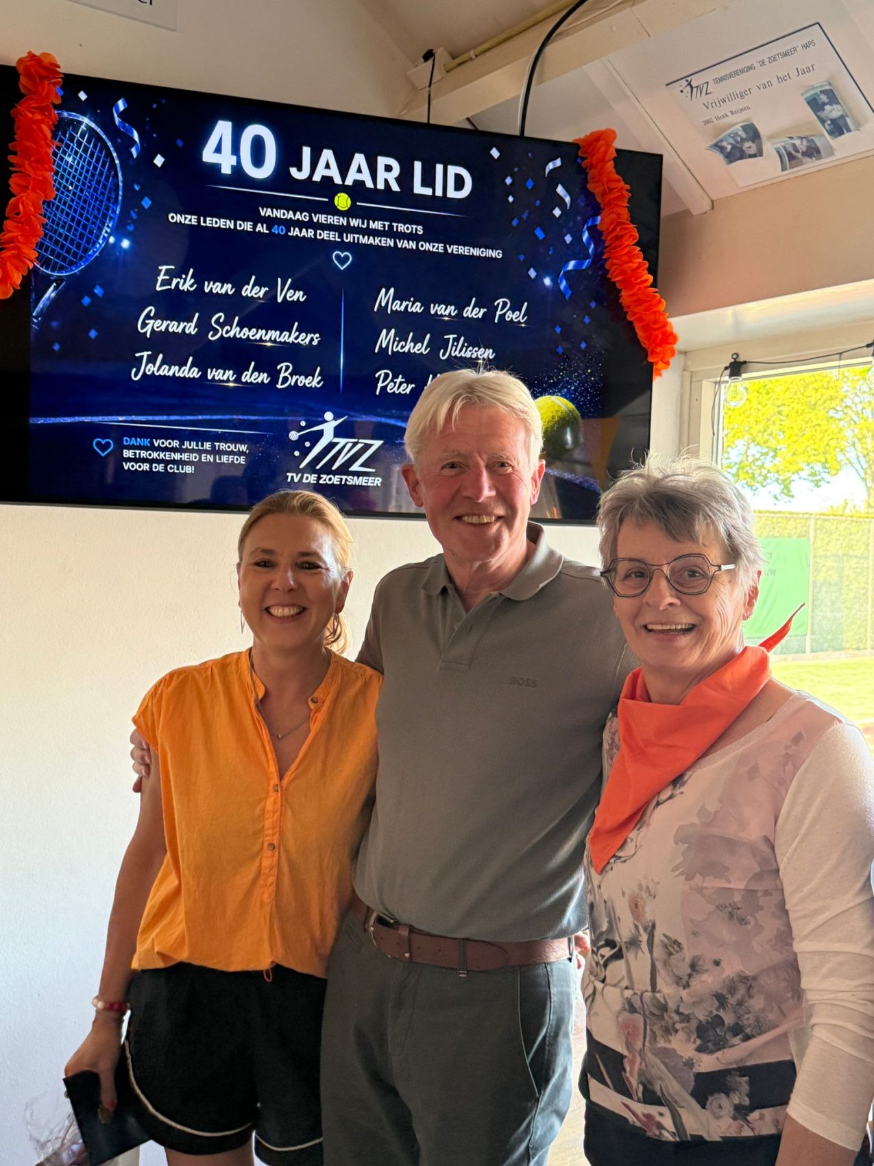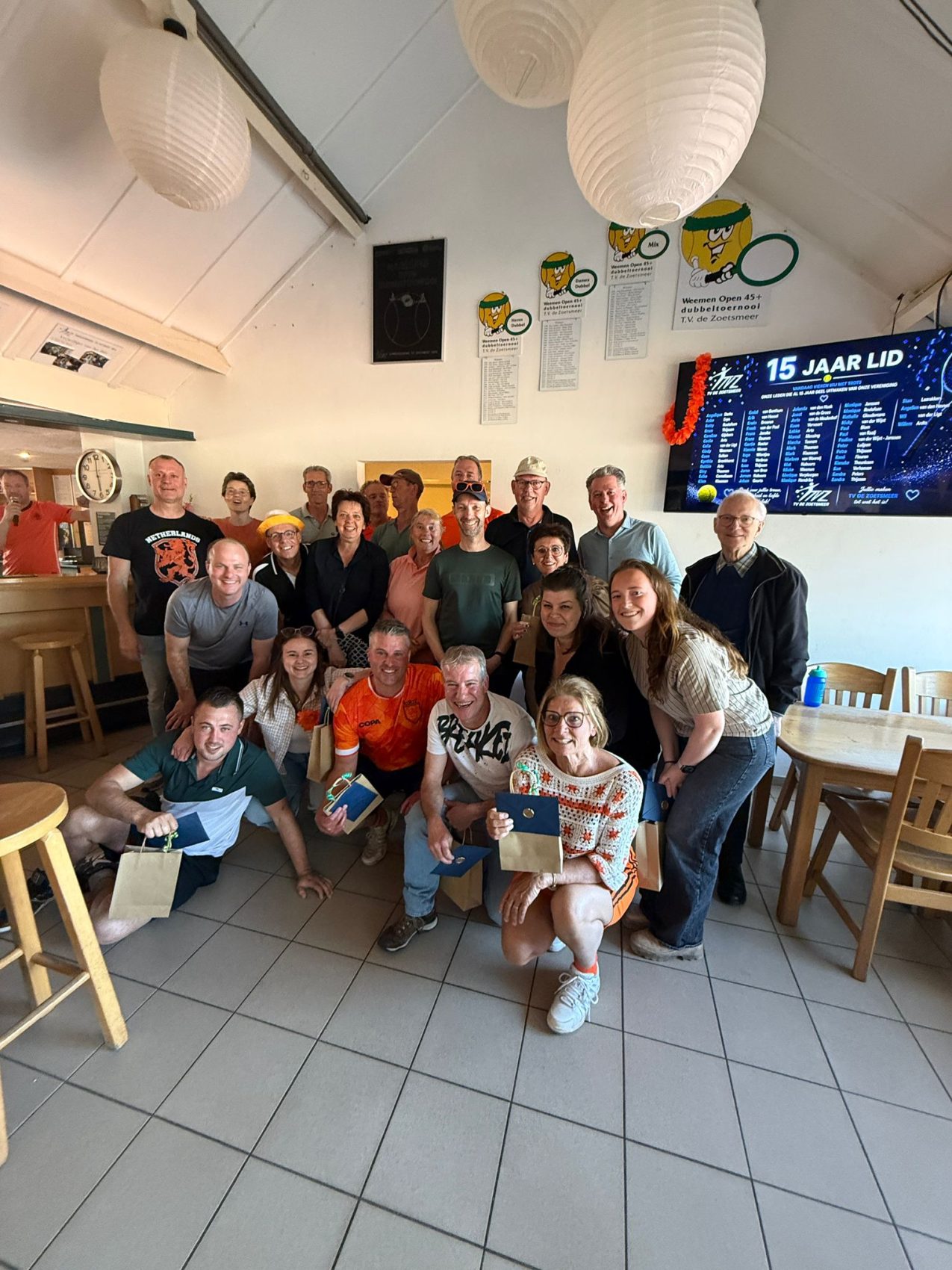 Vandaag is het 65 jaar geleden dat TV De Zoetsmeer werd opgericht. De tennisvereniging werd in 1961 opgericht door toenmalig burgemeester Baron van Hovell tot Westervlier, Ted Verschuren, Willy Hurkens en Toon Konings. De originele oprichter Willy Hurkens is aanwezig tijdens de jubileumviering op zondag 26 april jl. Nadat enkele tenniswedstrijdjes en tennisgerelateerde spelletjes waren afgewerkt door de meer dan 50 deelnemers kon begonnen worden met de huldiging van de jubilarissen. Jubilarissen van 15 jaar lidmaatschap, 30- 40 en 50+ werden in het zonnetjes gezet met een persoonsgericht kado. Na de fotosessies met alle jubilarissen kon de BBQ aangestoken worden. De uiterst geslaagde en zonnige zondagmiddag werd tot in de late uurtjes afgesloten met een drankje en een hapje.